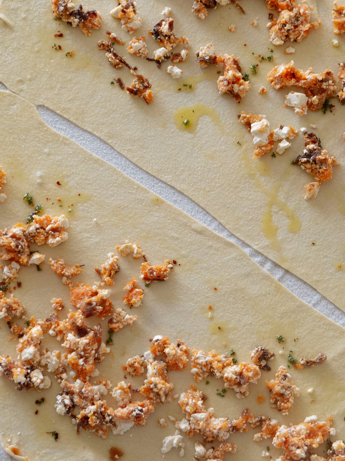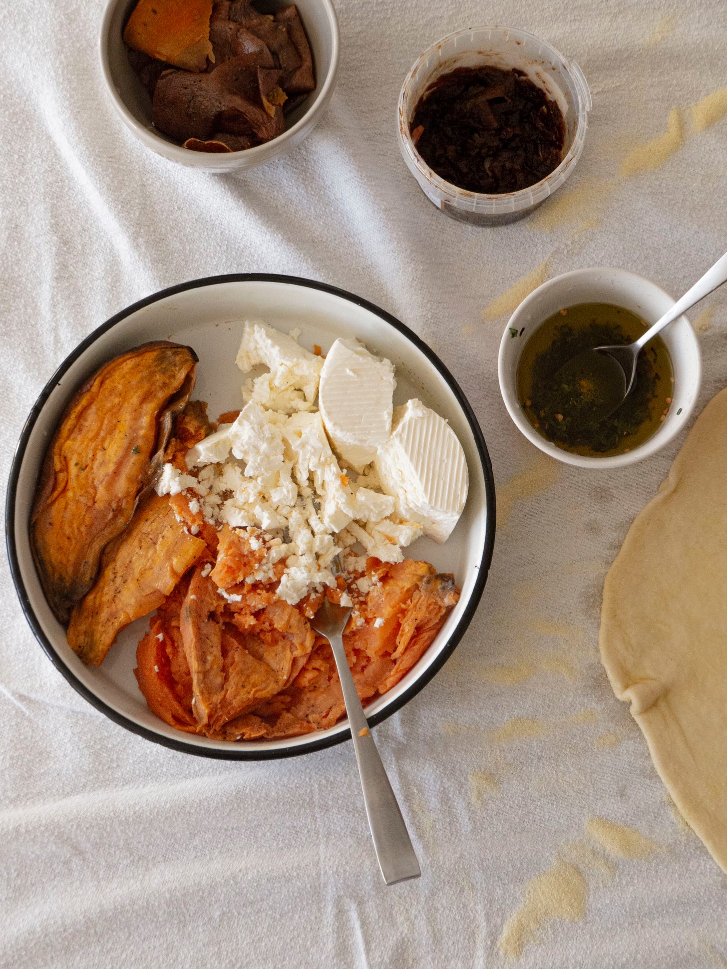 Bereid en rek het strudeldeeg volgens de aanwijzingen op blz. 215 en 220 in ZURE-KERSEN-HART. Snijd de uitgerekte deeglap in twee en besprenkel met ongeveer 3/4 van de tijm-chiliolie (houd de rest achter voor later). Verdeel de zoete aardappel, kaas en uienjam vulling gelijkmatig over het deeg en rol op tot twee strudels.