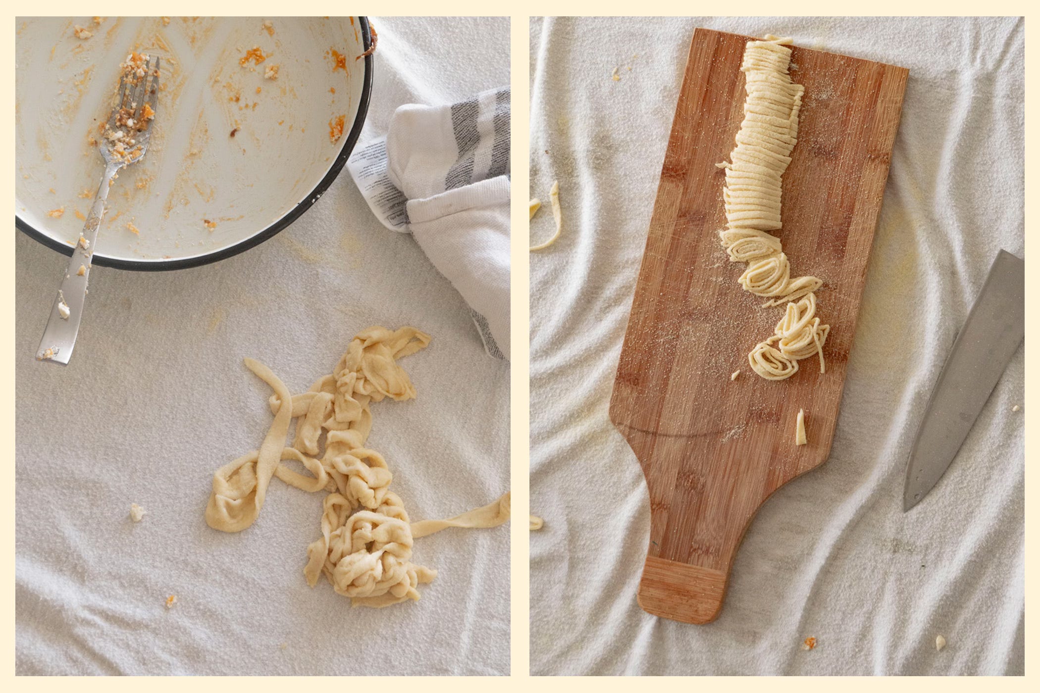 Kneed de afgedane randjes bij elkaar tot een bolletje. Gebruik daarbij extra semola of bloem. Rol het deeg uit met een deegroller tot zo dun mogelijk. Bestrooi met extra semola, rol op als een pannenkoek en snijd in dunne reepjes. Laat de pasta eventueel uitdrogen en gebruik in soep en bouillon.