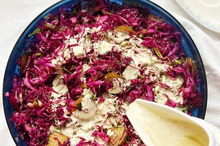 En een oogverblindende salade van rode kool en geroosterde bieten voor een heldere start.
