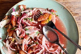 Salade van (bloed)sinaasappel, ui, venkel en olijven.